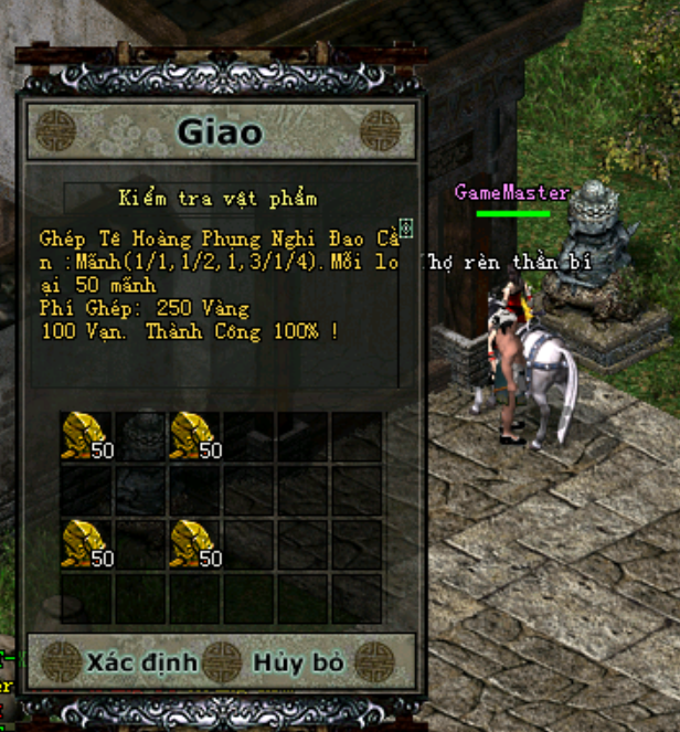 Chi phí: 100 vạn lượng + 250 xu + mảnh 1,2,3,4 mỗi loại 50 mảnh